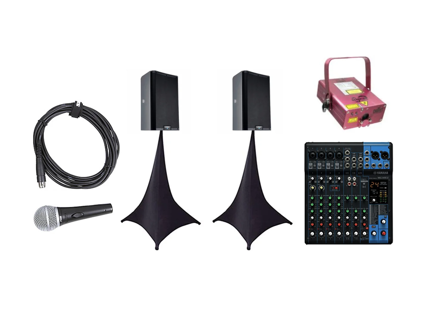 Built for high-energy house parties and private celebrations. Two QSC 12 speakers on tripod sta...